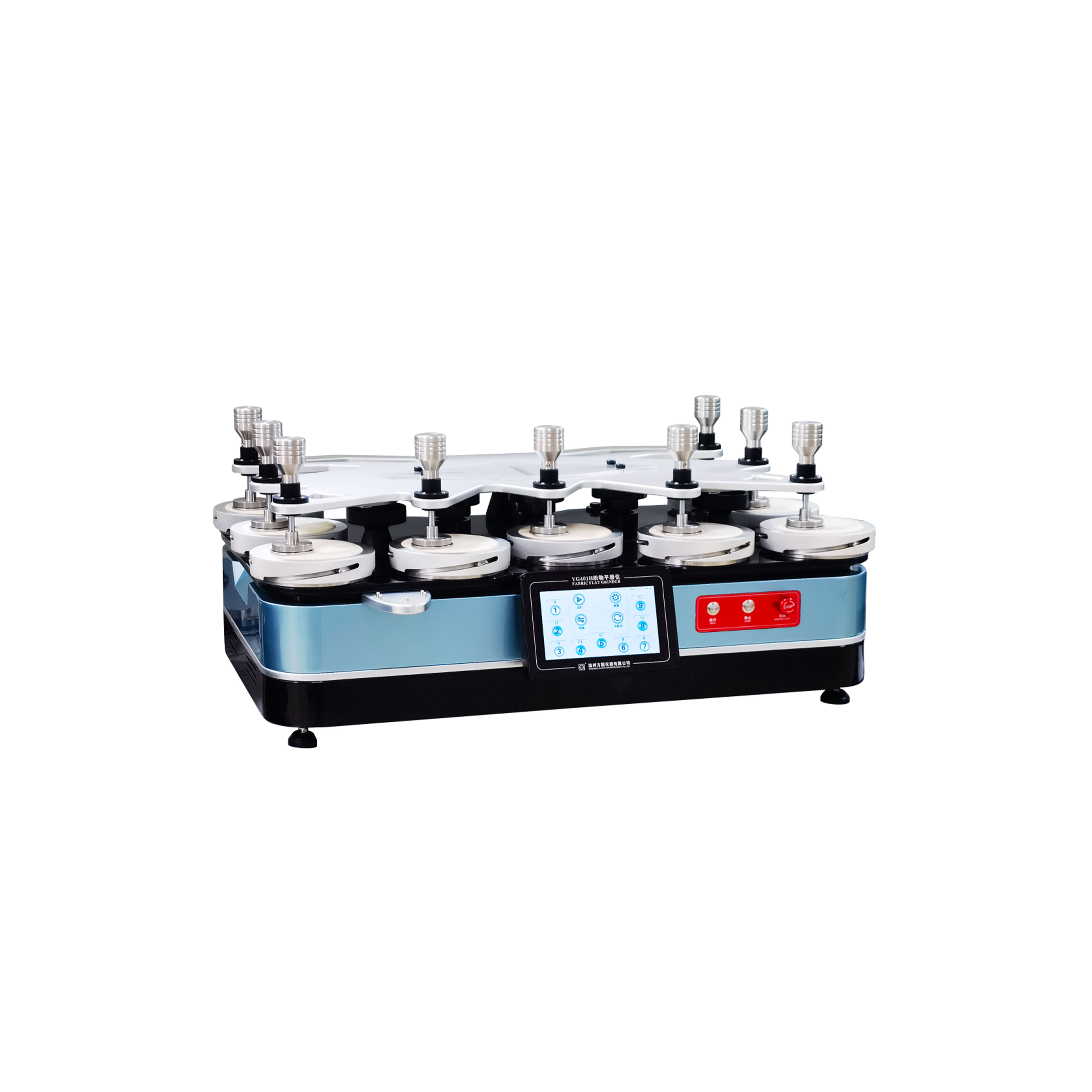 YG401H-II織物平磨極光儀(九工位馬丁代爾) GB/T4802.2-2008,GB/T13775,GB/T21196.1,GB/T21196.2,GB/T21196.3,GB/T21196.4;FZ/T20020;ISO12945.2、12947;ASTM D 4966、4970、IWS TM112,可以增加球盤法測試功能(選配)等標準。